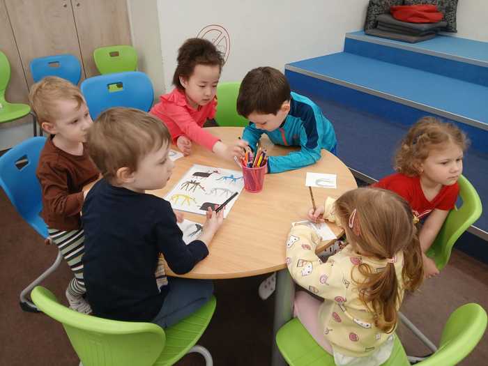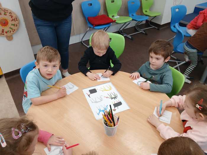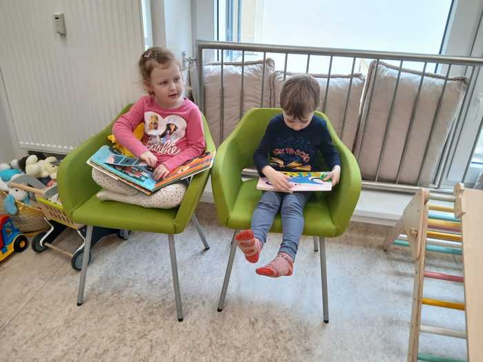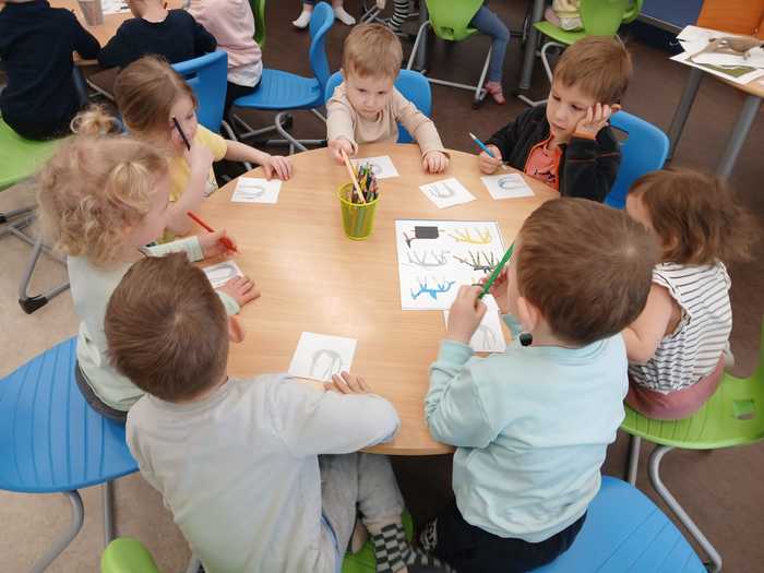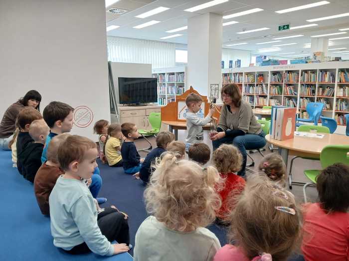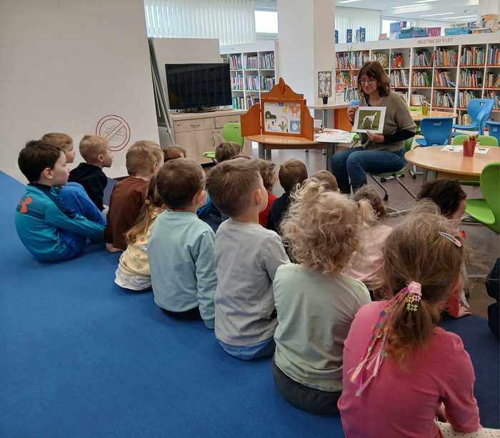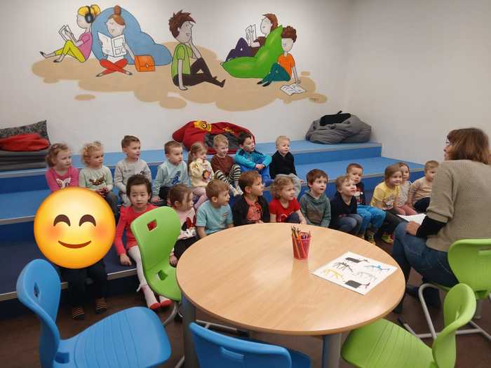 Úvod > O nás > Třída Motýlků > Fotogalerie Motýlků > V knihovně: "Dobře schovaný chrt".